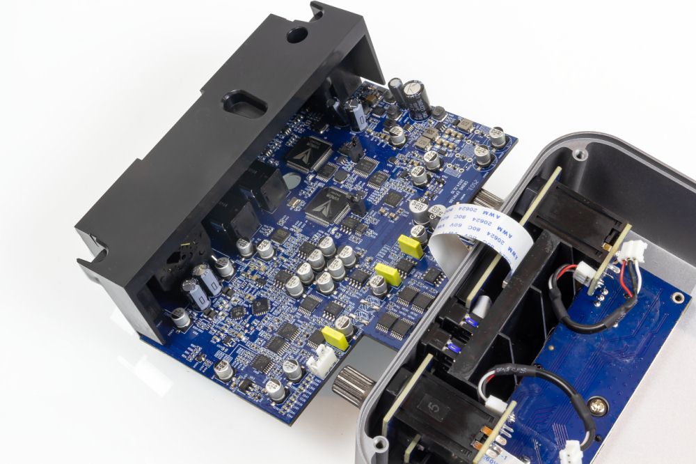 Электронная начинка состоит из качественных современных электронных компонентов. В качестве преобразователей используется АЦП ES9822PRO (динамический диапазон 125 дБА) и ЦАП CS43198 (динамический диапазон 130 дБА). Это конверторы топ-класса, которые раньше в устройствах для широкой аудитории увидеть было невозможно. Предусилитель реализован на известных американских чипах THAT. Мощный усилитель для наушников выполнен на чипе TI TPA6120A. Все ОУ дорогие качественные TI OP1678.
