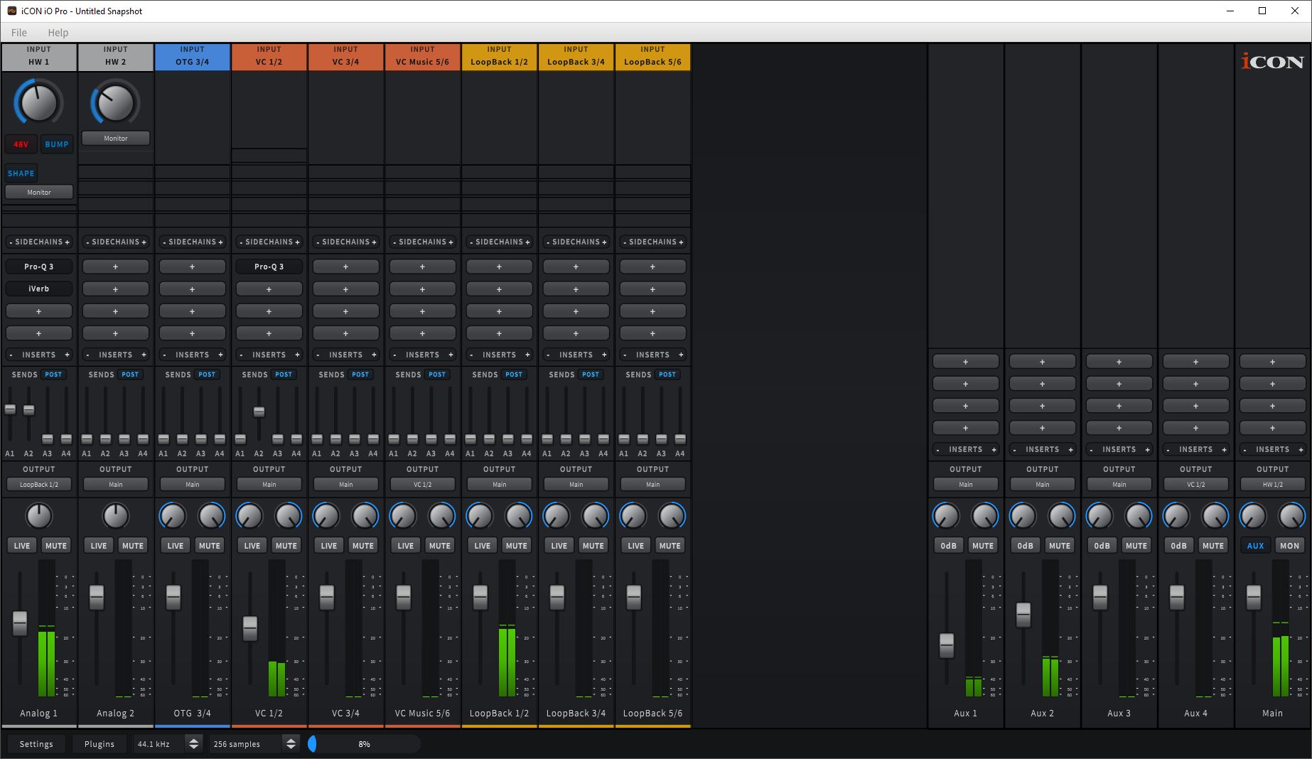 Микшер iO Pro сильно отличается от контрольной панели бюджетных интерфейсов iCON расширенными возможностями. Здесь предусмотрены привычные инсерты для размещения эффектов посылы на четыре AUX шины для создания сабмиксов, Looback каналы для записи микса или трансляции в интернете. Для удобства имеются пресеты со всеми настройками микшера, позволяющие быстро загрузить необходимую конфигурацию. А возможность масштабирования позволит подобрать размер микшера для любого разрешения, без потери качества изображения всех элементов управления. Очень здорово видеть, что интерфейсы серии Cube используют продвинутые функции управления флагманских устройств iCON.
