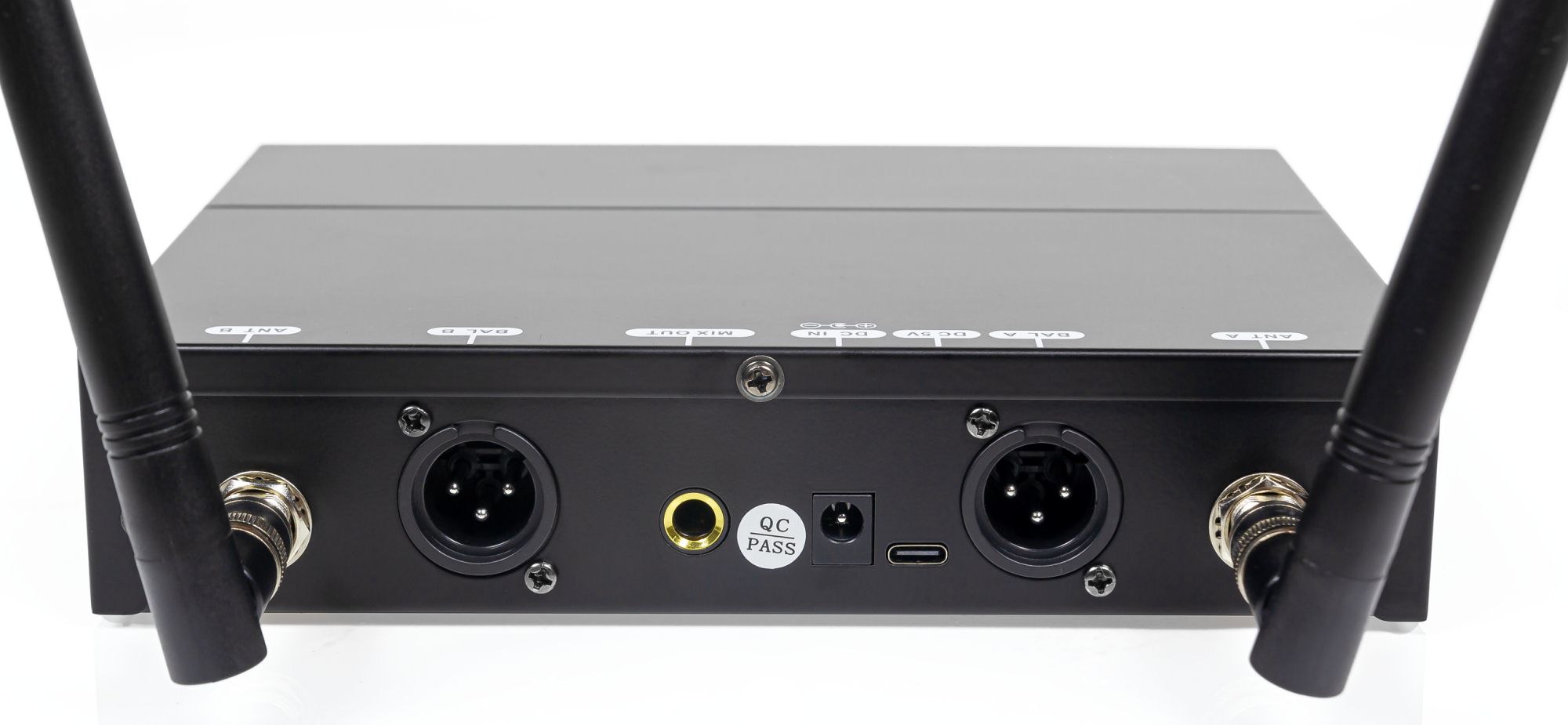 Подключение приемника к микшеру производится через раздельные балансные выходы с XLR разъемами. Кроме того, предусмотрен небалансный выход 1/4 TRS, объединяющий сигнал с микрофонов. Штатное питание приемника осуществляется от внешнего адаптера 12В. В качестве альтернативы радиосистему можно запитать и от 5В источника, например от пауэрбанка. Очень полезная функция, которая станет незаменимой на выездных мероприятиях или на открытом воздухе, где нет доступа к розетке или по каким-то причинам подключение невозможно.