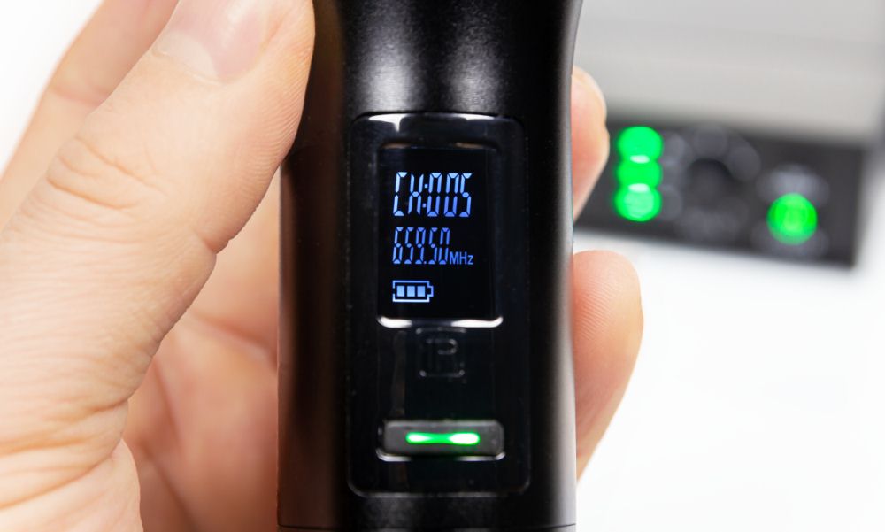 Микрофон оснащен небольшим дисплеем и кнопкой питания. На экране можно увидеть выбранный канал, его частоту и уровень заряда батареи. Дисплей отличается хорошей яркостью, которая автоматически снижается для экономии энергии. Рядом с дисплеем находится инфракрасный порт для синхронизации с приемником. Для полного отключения микрофона нужно удерживать кнопку в течение двух секунд. При выключении передатчика приемник автоматически прекращает работу неиспользуемого канала, чтобы избежать возможных помех.