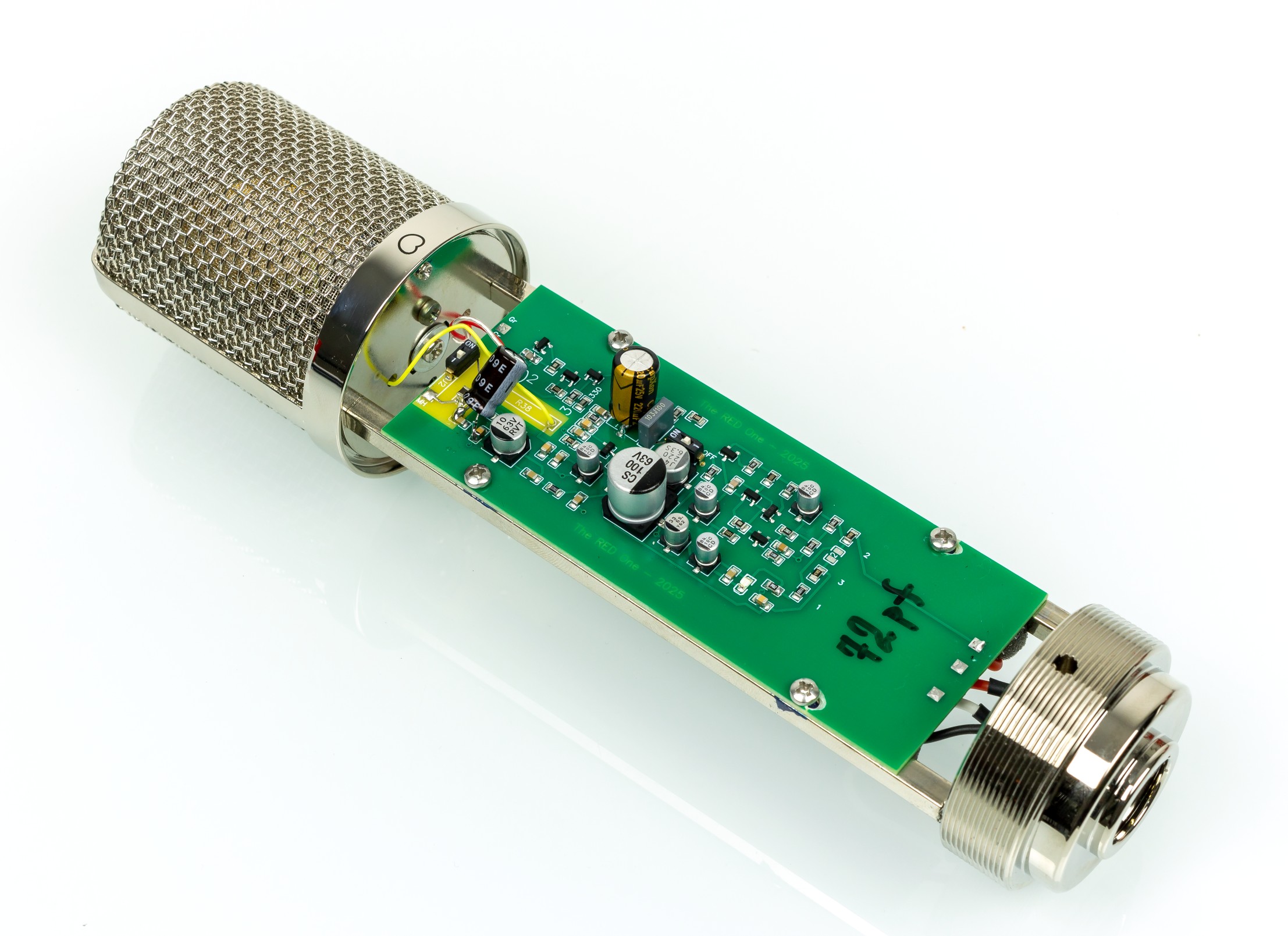 Линеаризованная безоосная схема микрофона собственной разработки исключает сглаживание фронтов и фазовые искажения, а низкое выходное сопротивление менее 33 Ом позволяет подключать микрофон длинными кабелями без потери качества сигнала. На фото платы видны современные качественные радиоэлектронные компоненты, без применения каких-либо микросхем, трансформаторов или разделительных конденсаторов по пути следования сигнала от капсюля к выходу. Заявлен широкий частотный диапазон 150 кГц и минимум искажений, что позволяет получать запись без окраса и далее выбирать нужную обработку на стадии постпродакшн.