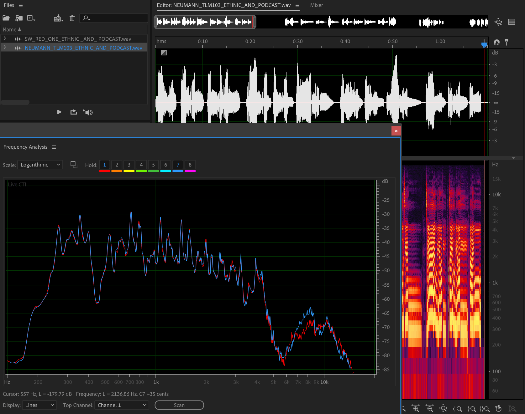 На спектре показана разница между двумя микрофонами при осреднении одного и того же фрагмента. Синим цветом показан Neumann, красным - SWA. В области презенса 1,5-3 кГц у красного графика небольшой подъем. Обычно эту зону искусственно эквализуют для повышения разборчивости речи. В то время как зона сибилянтов около 8 кГц у SWA приглушена на внушительные 6 дБ, что делает прослушивание записи вокала комфортной даже без деэссера.