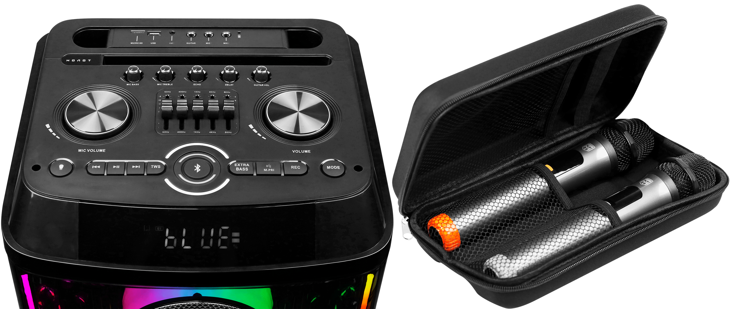 Новинка может похвастать мощностью 3000 Вт и чистым звуковым транслированием. Колонка оснащена двумя 12” динамиками и 1” твитером, обеспечивающими глубокие НЧ и чёткие ВЧ. Продукт может использоваться в роли полноценного караоке-центра с возможностью записи выступлений. Отмечается, что колонка имеет LED-подсветку с яркими световыми эффектами, а в комплекте предусмотрено два беспроводных микрофона и пульт дистанционного управления. Кроме этого, имеется встроенный аккумулятор с функцией Powerbank, обеспечивающий до восьми часов автономной работы в режиме воспроизведения, а также технология TWS для объединения двух колонок в стереопару.