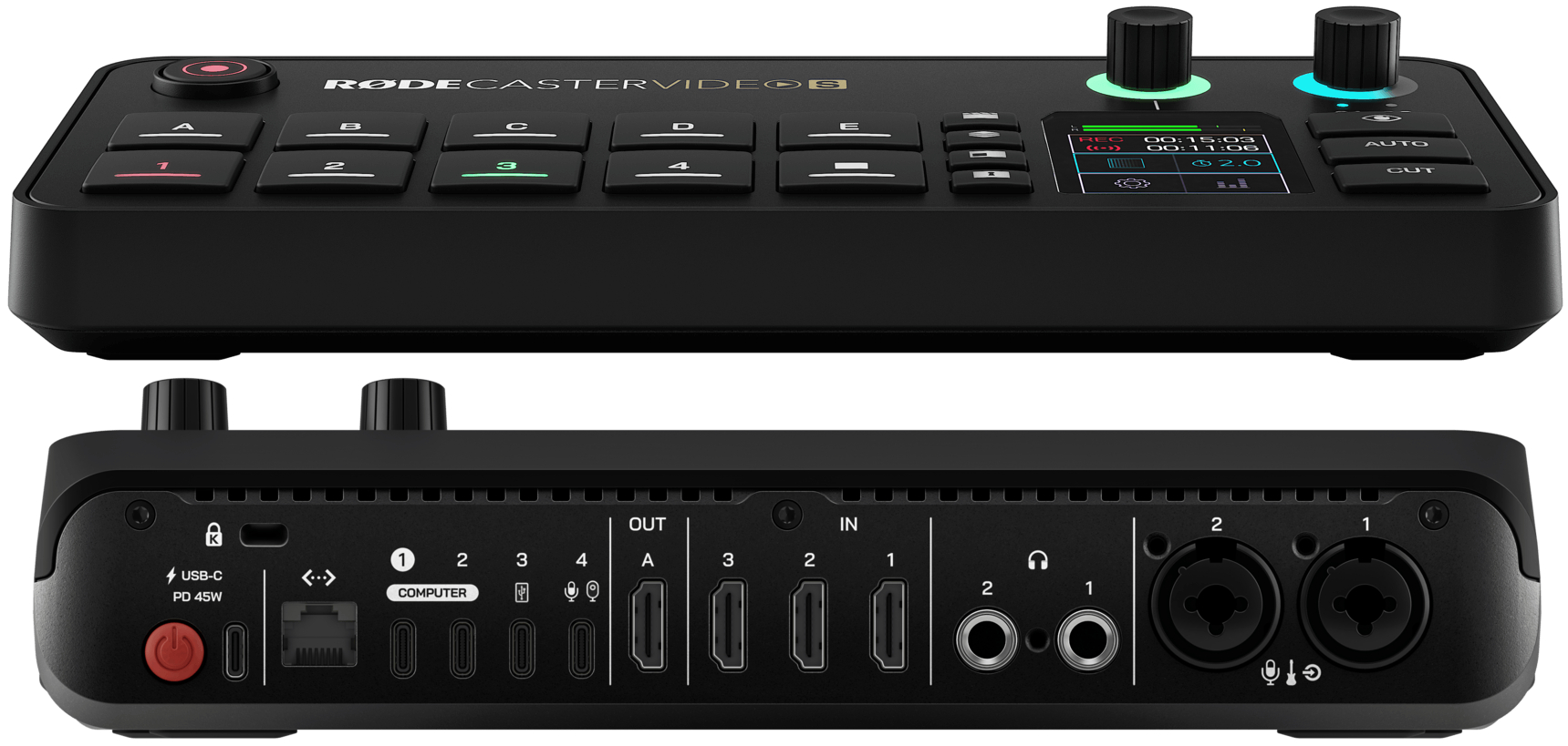 Другие возможности продукта: восьмиядерный процессор; встроенная система обработки звука - APHEX (Compression/De-Essing/High-Pass Filter/EQ/Stereo Imaging/Compellor/Aural Exciter/Big Bottom); поддержка Bluetooth 5.3 и двух беспроводных микрофонов RODE (Series IV); 2” сенсорный дисплей; приложение RodeCaster для настройки параметров; потоковая передача по Wi-Fi и Gigabit Ethernet; поддержка PTZ-камер NDI HX2/HX3; два малошумящих предусилителя Revolution Preamps с комбинированными разъёмами XLR/TRS (Neutrik); два TRS разъёма под наушники; три HDMI (full HD 1080p) входа и один выход; пять портов USB-C.
