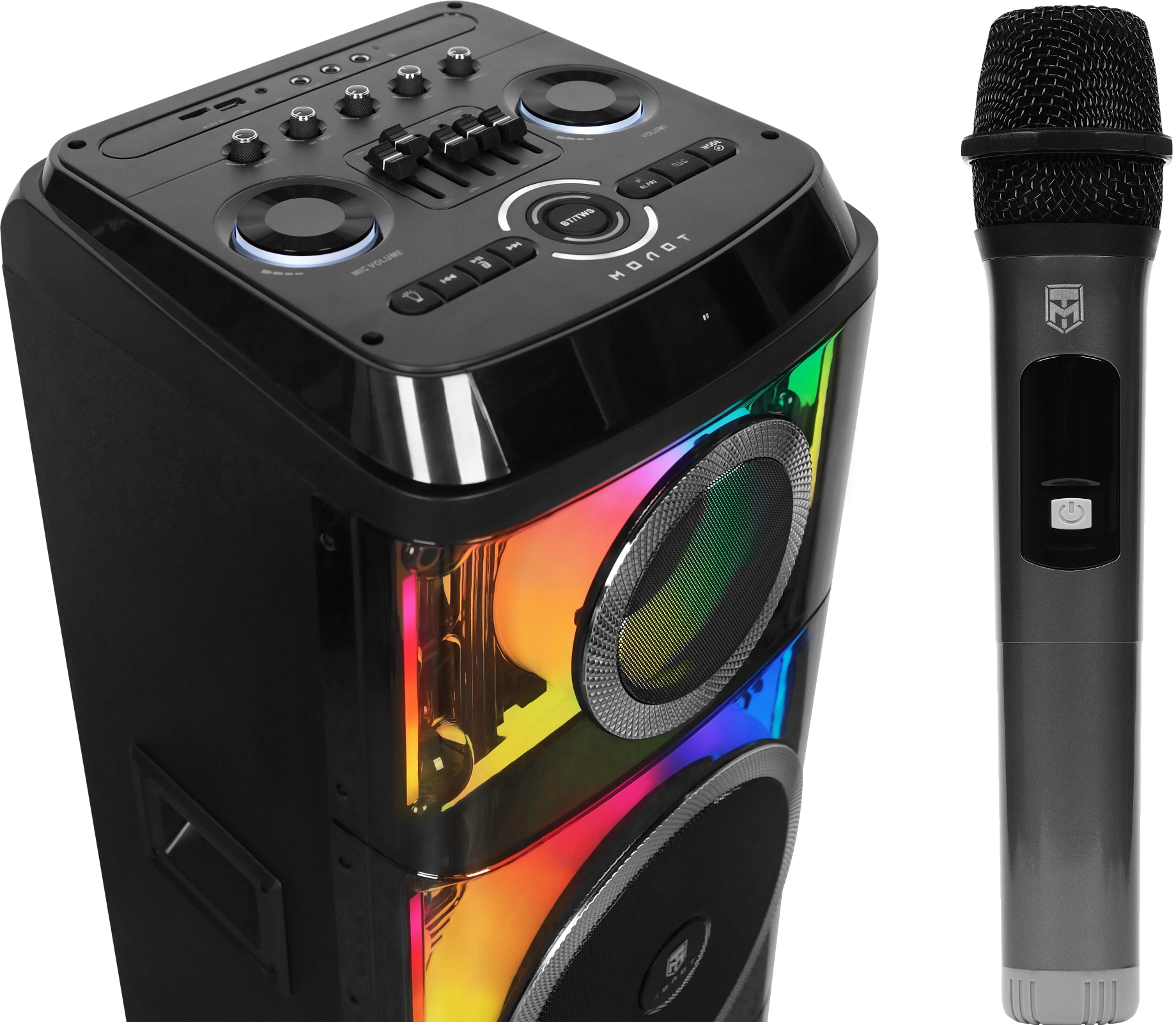 Новинка оснащена двумя 8” динамиками и 1” ВЧ-излучателем, а также обладает мощностью 2000 Вт и парой фазоинверторов на задней стороне. Колонка может похвастать чистым звуковым транслированием и режимом TWS (с поддержкой таких моделей как МОЛОТ 103/203/213), позволяющим объединить две системы в стереопару. Кроме этого, предусмотрены боковые ручки для переноски и один беспроводной микрофон в комплекте.