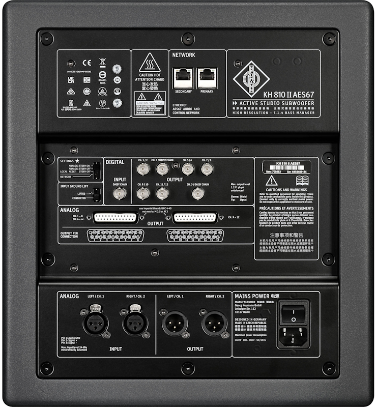 Модель 810 II, помимо порта RJ45 (Network), располагает двумя аналоговыми входами и выходами XLR (для работы в стереорежиме), а также двумя разъемами Sub D25 для 12 аналоговых входных каналов и двумя разъемами Sub D25 для 11 аналоговых выходных каналов. Однако, сабвуфер доступен в версии AES67 для возможности подключения по цифровому протоколу через разъём AES3 (BNC).
