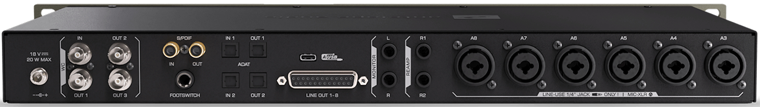 Коммутационные возможности включают: цифровое расширение через ADAT (16 каналов) и S/PDIF (2 канала), шесть комбинированных микрофонных/линейных входов (XLR/TRS), два комбинированных микрофонных/линейных/Hi-Z входа (XLR/TRS), линейный выход через D-Sub 25 (8 каналов), мониторный выход L/R (TRS), два выхода реампа (TRS), два входа/выхода ADAT (до 16 каналов), вход/выход S/PDIF, один вход и три выхода BNC Word Clock, вход для ножного переключателя, порт USB-C (2.0).