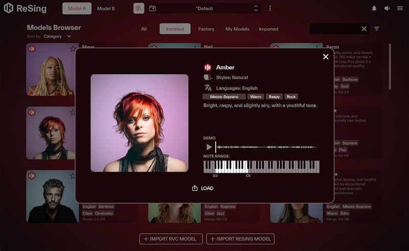 Новинка представлена в виде плагина и отдельного приложения. Плагин разработан с помощью передовой технологии искусственного интеллекта, обеспечивающей уникальный тембр, тон и экспрессию настоящих артистов. Он предоставляет библиотеку из 25 голосов и 25 инструментов с поддержкой английского и испанского языков. Однако, ReSing позволяет создавать собственные вокальные инструменты благодаря возможности загрузки стемов в ReSing Modeler и дальнейшего обучения, а также импорту любых RVC моделей, доступных онлайн.
