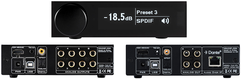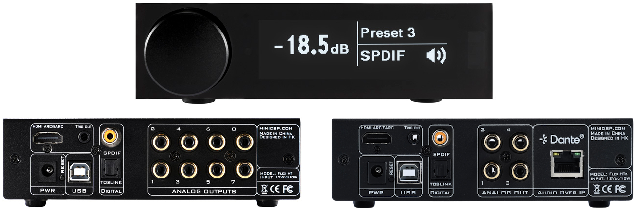 Пользователям на выбор доступно две версии: Flex HT (стандартная модель с восьмиканальным DSP, HDMI eARC, USB Audio, входами SPDIF/TOSLINK и аналоговыми выходами) и Flex HTn (возможность передачи звука по IP-сети Dante/AES67 с бесперебойной многоканальной цифровой потоковой передачей звука по сети на совместимые акустические системы, усилители и процессоры). Отмечается, что обе модели имеют идентичный компактный форм-фактор и вычислительную мощность, что позволяет выбрать версию, которая лучше всего подходит для конфигурации системы пользователя — традиционной аналоговой или полностью сетевой AoIP.